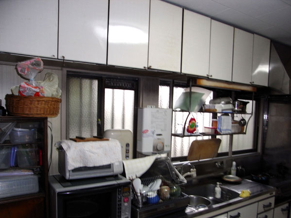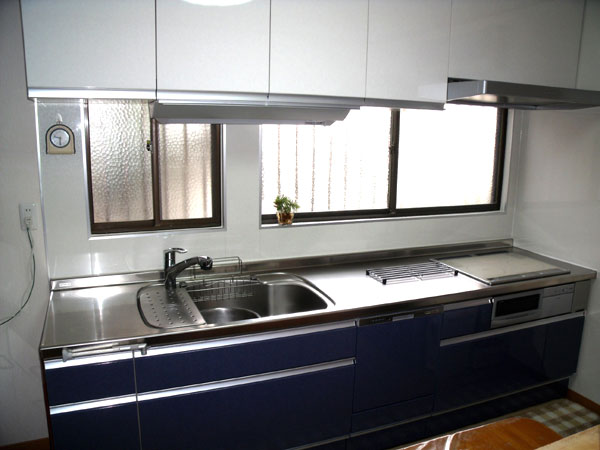 ブロックタイプのキッチンセットをシステムキッチンに入れ替えました。吊戸棚と下台の色を替えメリハリをつけました。
