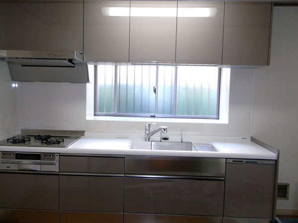 キッチンのリフォーム例です。白いキッチンパネルを張ることで狭いキッチンも広がりが出てきます。