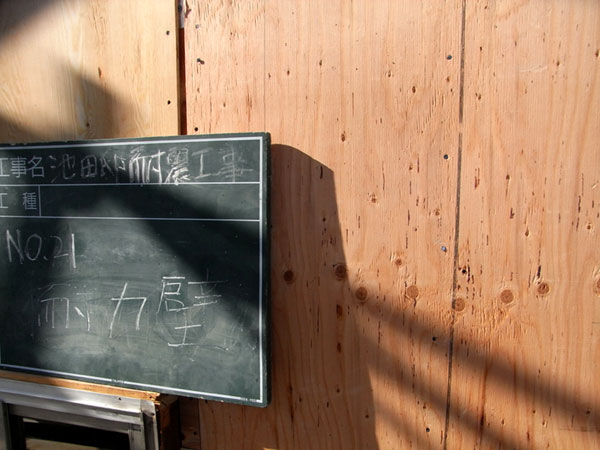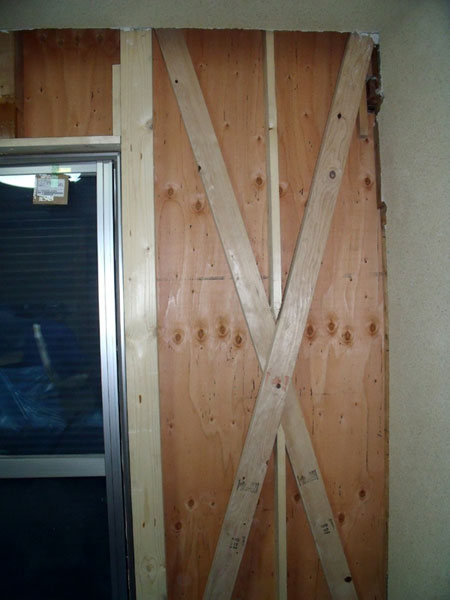 もうひとつの耐力壁として合板を柱間に張る方法があります。この場合、合板は9ミリの厚さ以上で、N50の釘で150㎜ピッチ以内で固定します。