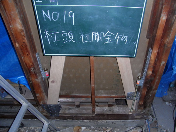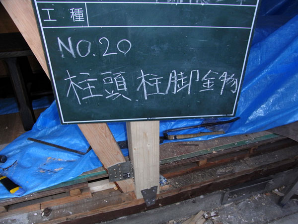 柱に対する引き抜き力がさほどかからない箇所には写真のような金物を使います。それぞれの柱にかかる引き抜き力はN値計算法で求めます。