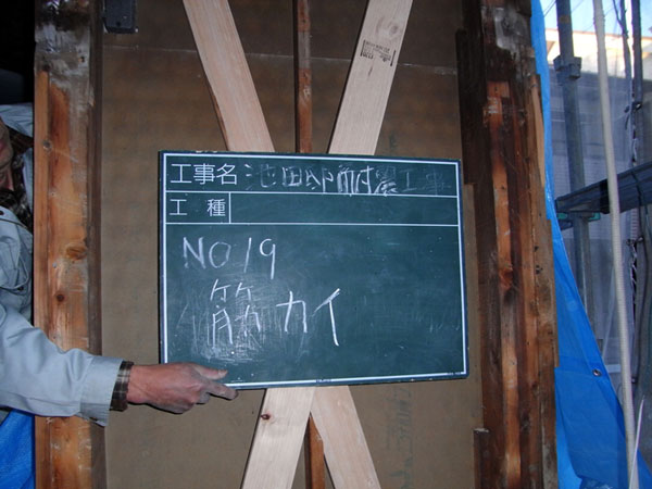 地震のときの水平力に抵抗する壁を耐力壁といいます。これは写真のように柱と柱の間に斜め材を入れます。