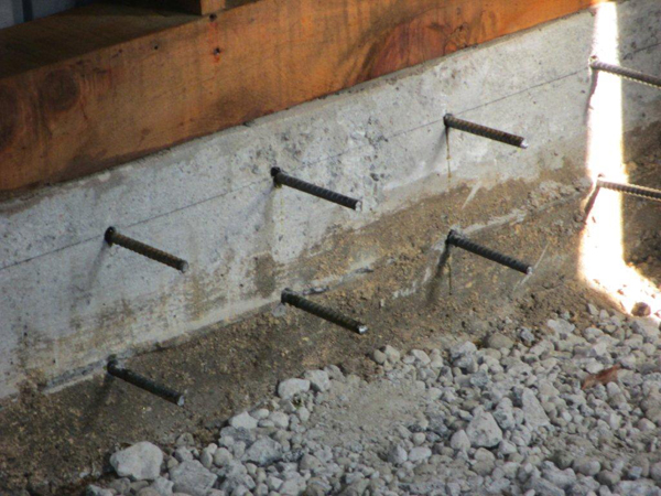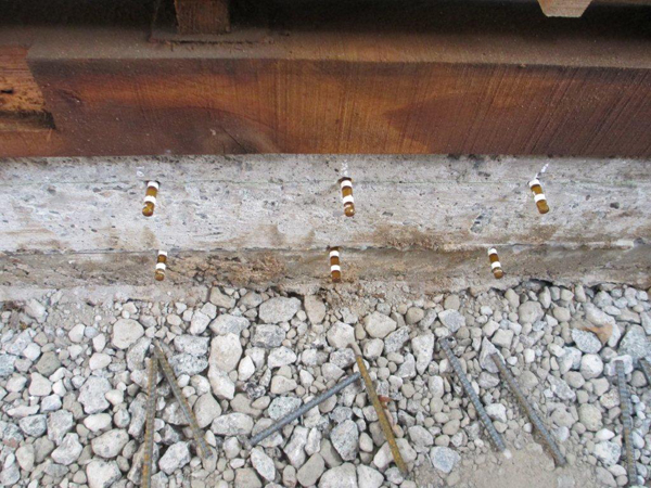 既存の基礎に穴をあけ、1本、1本にガラス入りの接着剤を入れていきます。