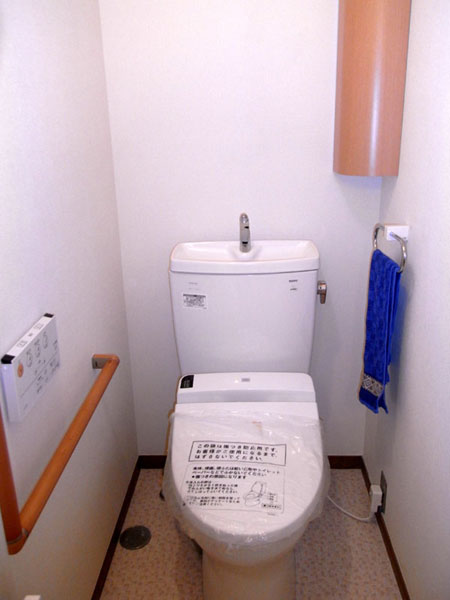 マンションのトイレの改修例です。内装クロスの張替、便器の交換、手摺の取付けをしました。