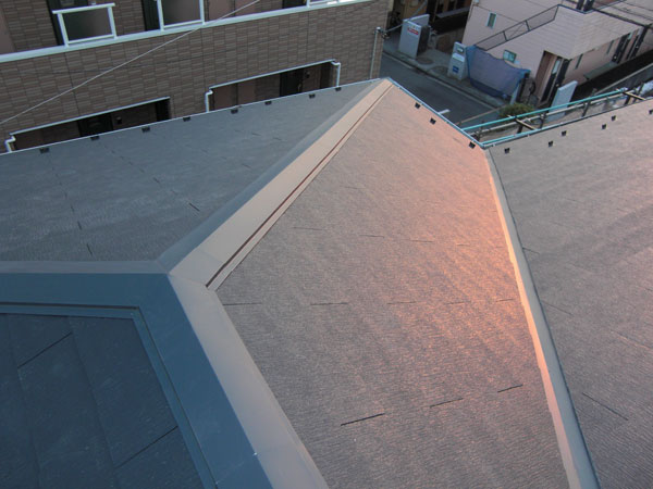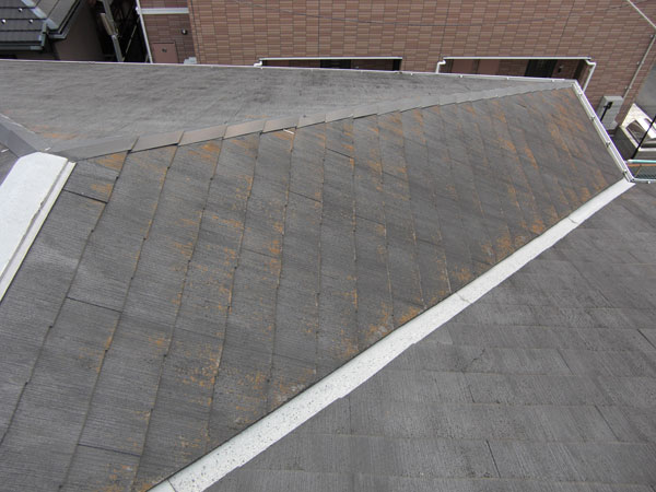 屋根葺き替えリフォーム 横浜市瀬谷区 2026/03/12 最終更新日時 : 2026/03/12 ziusadmin 薄型スレートの葺き替え例です。全体的にコケやカビが付着している状態でした。 Before(施工前) After(施工後)