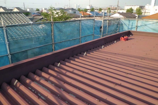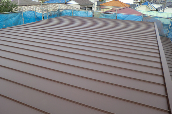 折板の屋根を、ガルバリウム鋼板縦はぜ葺きに葺き替えました。