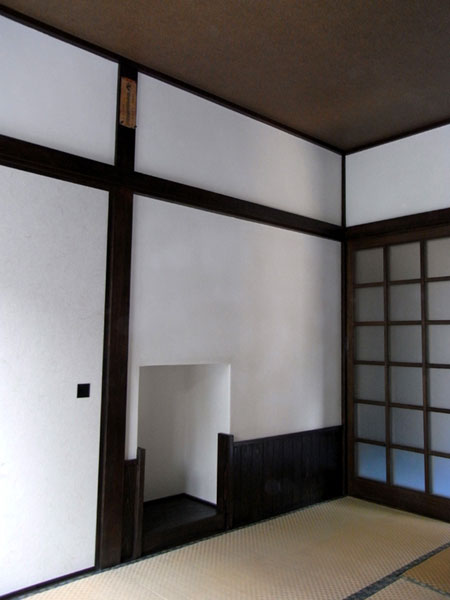 和室の模様替え事例です。腰壁に杉の無垢板を張り、腰から上は漆喰塗りで仕上げました。さらに木部を濃茶色で塗装し古民家風に仕上げました。階段下のデットスペースにお造りした床の間風のニッチスペースがポイントになっています。
