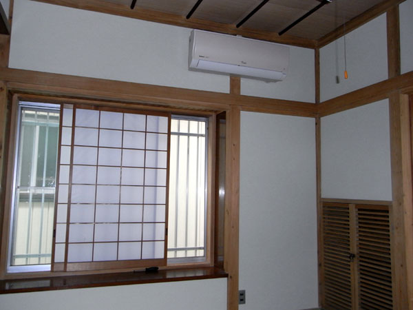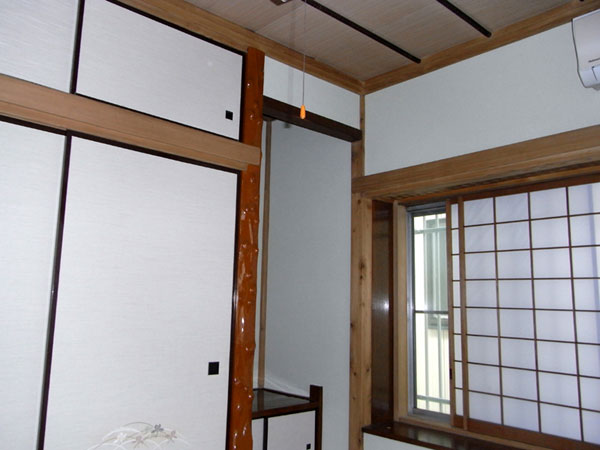 和室の模様替え事例です。古い京壁を落とし、珪藻土塗りで仕上げました。さらに変色した木部は灰汁洗いを施し、きれいな和室によみがえりました。珪藻土や漆喰などは自然材料ですので健康に適しています。