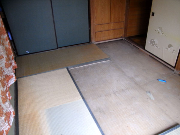 畳をはがします。畳の下は写真のようにベニヤが貼ってある場合と、10センチ巾程度の板が張ってある場合とがあります。