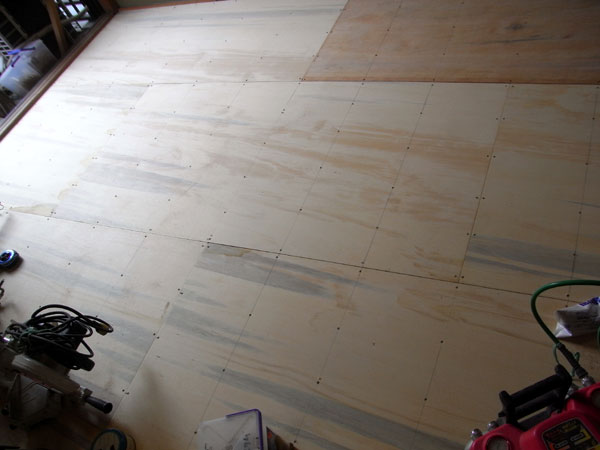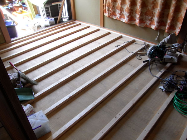 根太材の上に合板を張ります。フロリングだけに比べ床が丈夫になります。