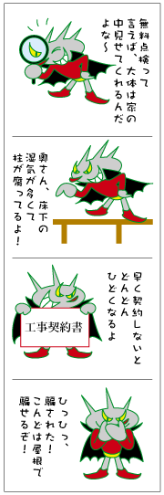 訪問リフォームのきっかけは「屋根瓦がずれています。割れています」、「外壁、基礎にひびが入っています」、「排水枡にひびが入っています」などと言い無料点検と称し家に上がりこみ「柱が腐っている」「雨漏れしている」「シロアリが発生している」などと偽り「このままでは家がつぶれる」と不安感をあおり、最終的に不必要なリフォーム契約を結びます。また「モニタールームとして使わせていただければお安くします」などと言い、もともと法外な見積もり金額を大幅値引きし、さも格安で契約したように見せ、実際には適正価格よりも高い工事金額で契約を結ぶことも悪徳リフォームの常套手段の一つです。