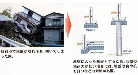 戸建の住宅であればスエーディング式サウンディング調査と呼ばれる簡単な地盤調査により地盤の強さを計ることができます。(費用は3万円から5万円程度)この結果により、地盤の強さに見合った基礎を設計することが必要です。ちなみに地耐力が30kN以上は布基礎とし、地耐力が20~30kNではベタ基礎とし、地耐力20kN以下では杭基礎としなければなりません。