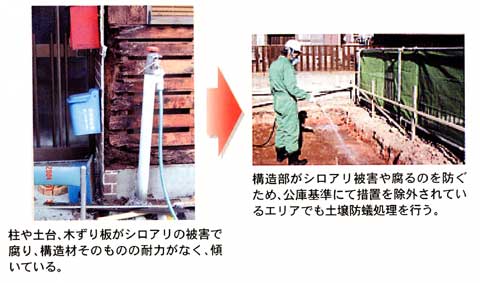 過去の地震において、土台や柱のシロアリ蟻害によるための倒壊が多く見うけられました。