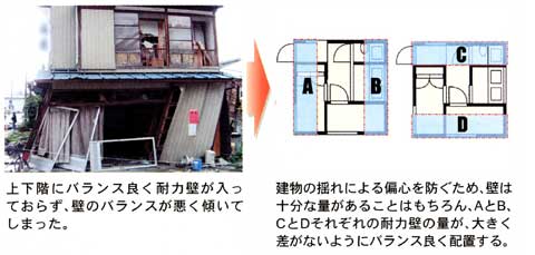 このためにも耐力壁はバランスよく配置することが重要です。前述の基準法の変遷にもあるように平成12年からはそれまでの「スジカイはバランスよく配置する」というあいまいな基準が数量化され一定以上の壁比率が義務化されました。