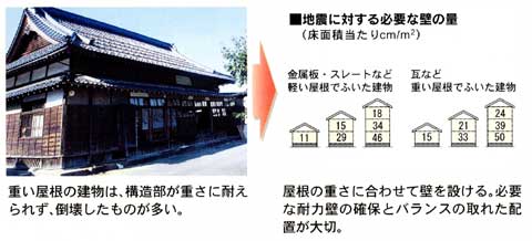 地震時の横揺れは建物の重量に比例して大きくなります。瓦などの重い屋根はスレートや鉄板葺きなどの軽い屋根に比べその単位面積あたりの重量は約3倍程度あります。そのため耐力壁も軽い屋根以上に設ける必要があります。