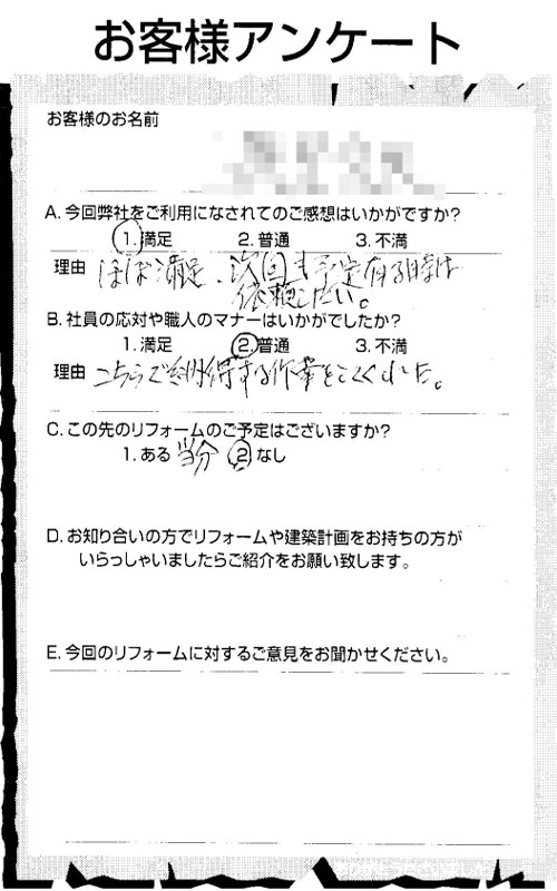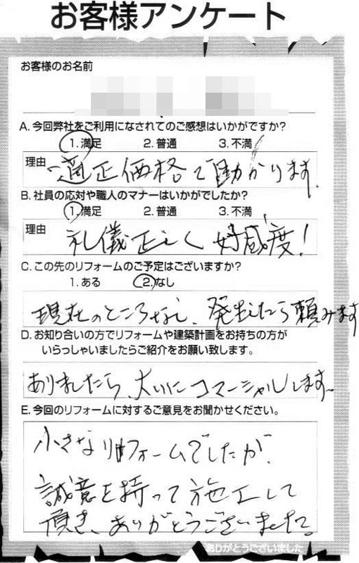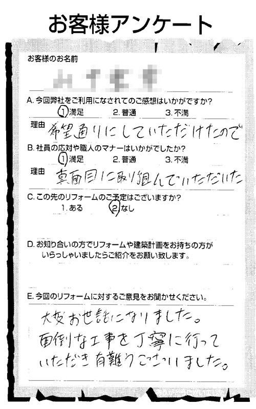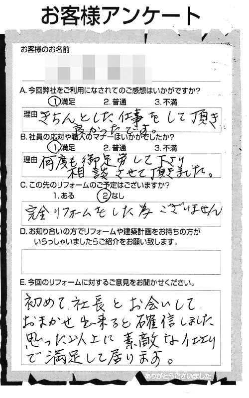仕事が丁寧で仕上げがよい。工事も予算内で済み満足している。会社の姿勢が気に入った。社長が自ら見積もり等に来ていただき、職人さん達も明るくテキパキと気持ちが良い。