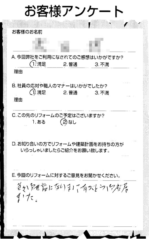 担当者の人柄にとても好感を持っています。担当者からの意見や提案が、私のフィーリングにあっていたのも良かったです。リフォーム内容ですが、間取りについては自分なりに色々考えていたようにできたし、仕上がりについて満足しているし、今回のリフォームにおいて「いやだな」と感じたことがどこもなかったので、また利用する機会があれば利用したいと思っています。