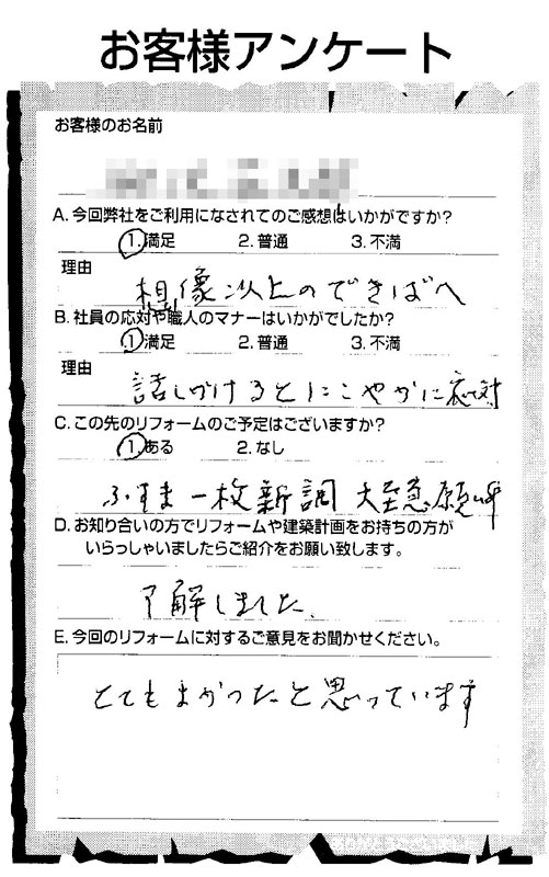 仕上がりも良く、大変満足しております。見違えるようにきれいになり、毎日の生活もとても快適です。ありがとうございました。