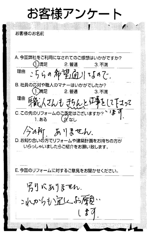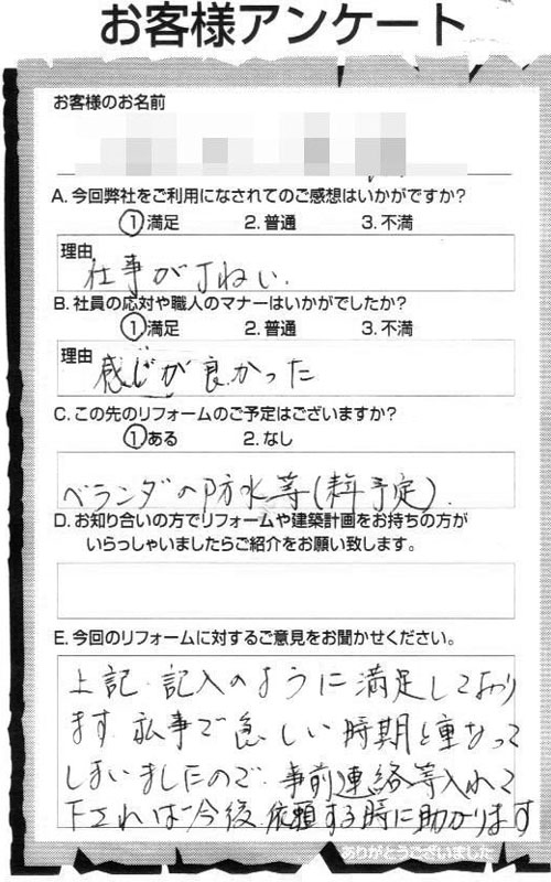 出入りする人が皆さんすごく感じのよい人ばかりとても好感をもてました。作業の始まり終わりには声をかけてくれたりと、今まで色々な業者にお願いしてきたけれども一番きちんとした印象をうけました。後片付けもとてもきちんとしていて、ごみはきちんと持って帰ったし、今日が無理でもその翌日には必ずといった風でこちらを煩わせることがありませんでした。仕事についてもきちっと仕上げてくれていて大満足しています。これからもぜひお願いしたいと思っています。