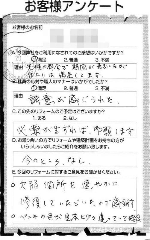 サイセンホームでは。顧客満足度をさらに追求するため、完工引渡し後にアンケートを頂戴しております。